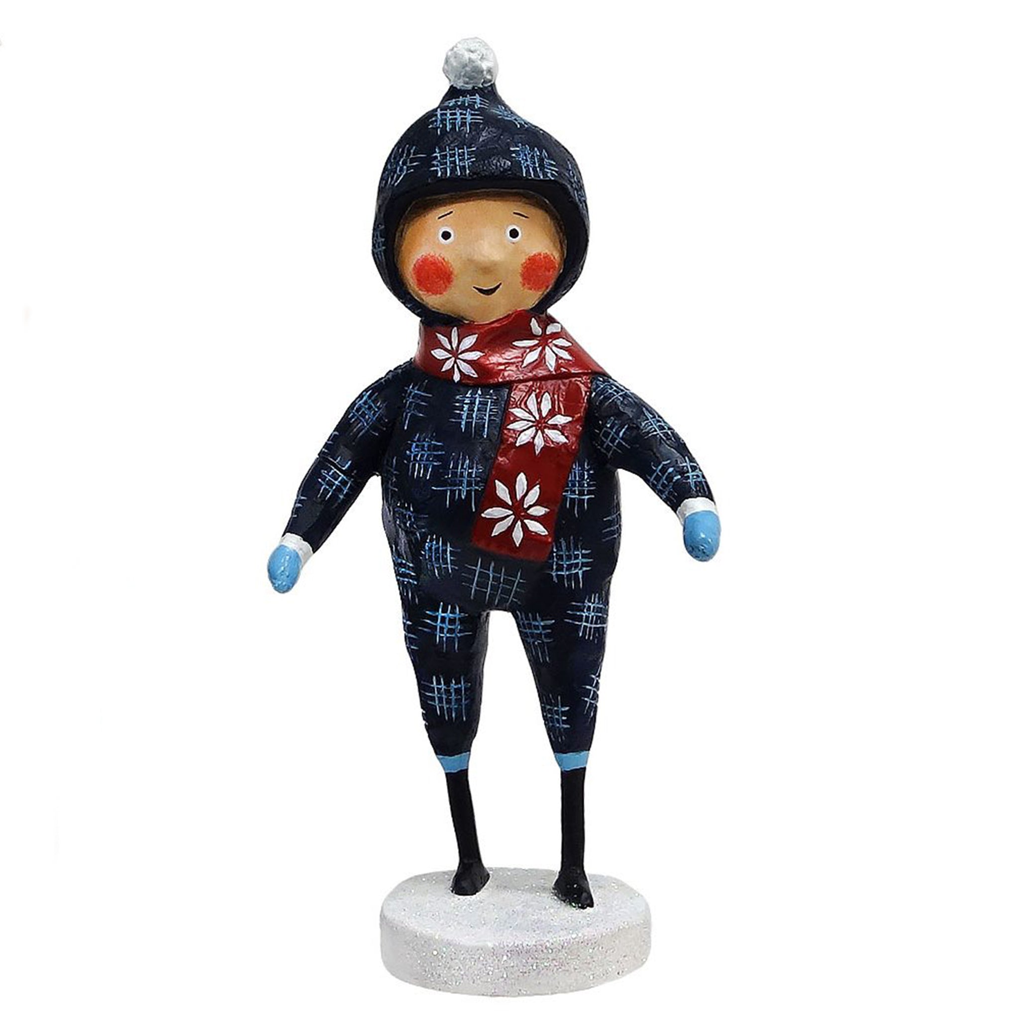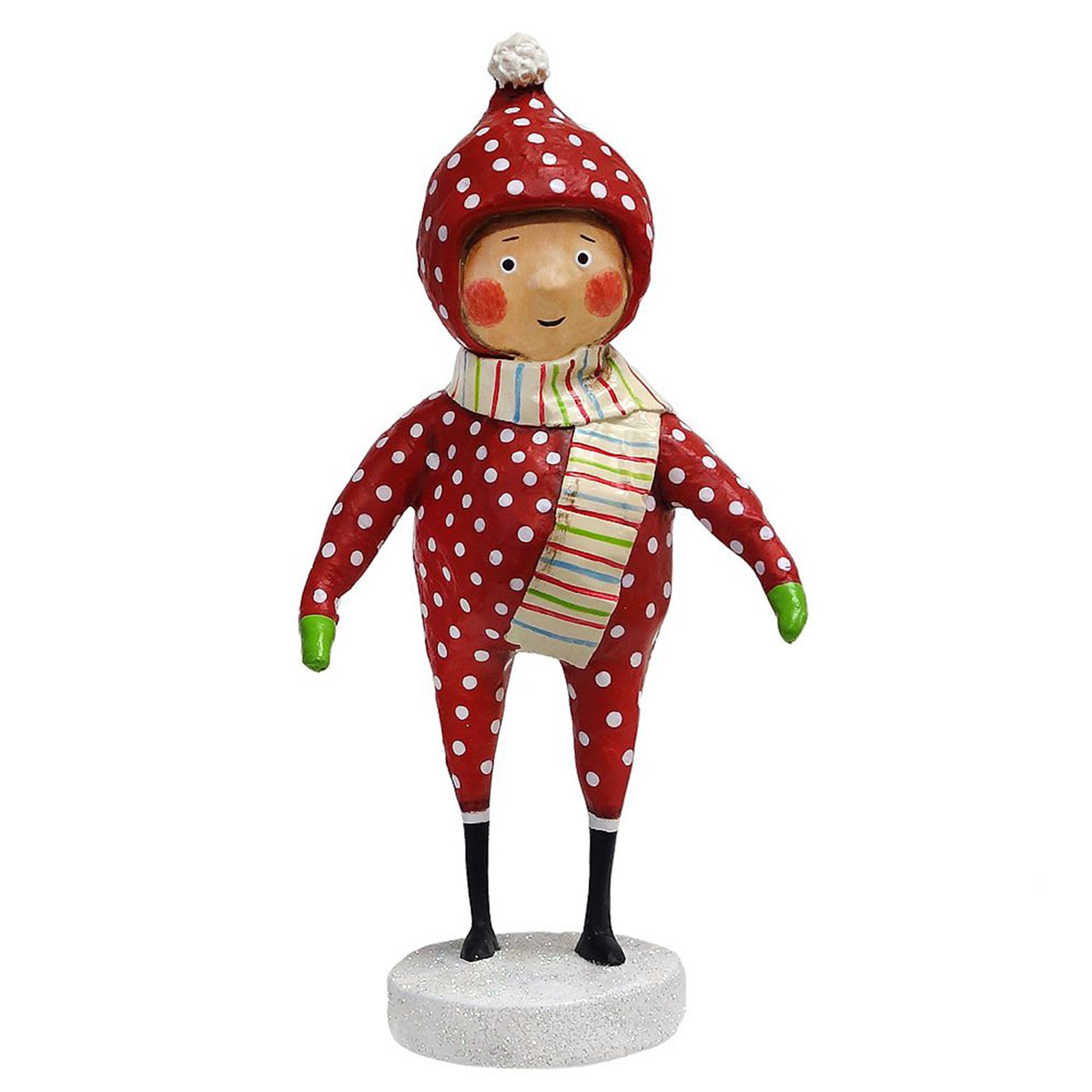 This Snowy Day Duo are finally bundled up well enough to go out and play in the snow. With the boy in a blue crosshatch pattern snowsuit and the girl in a red polka dot snowsuit, these two are suspiciously on their best behavior. Each 6”.