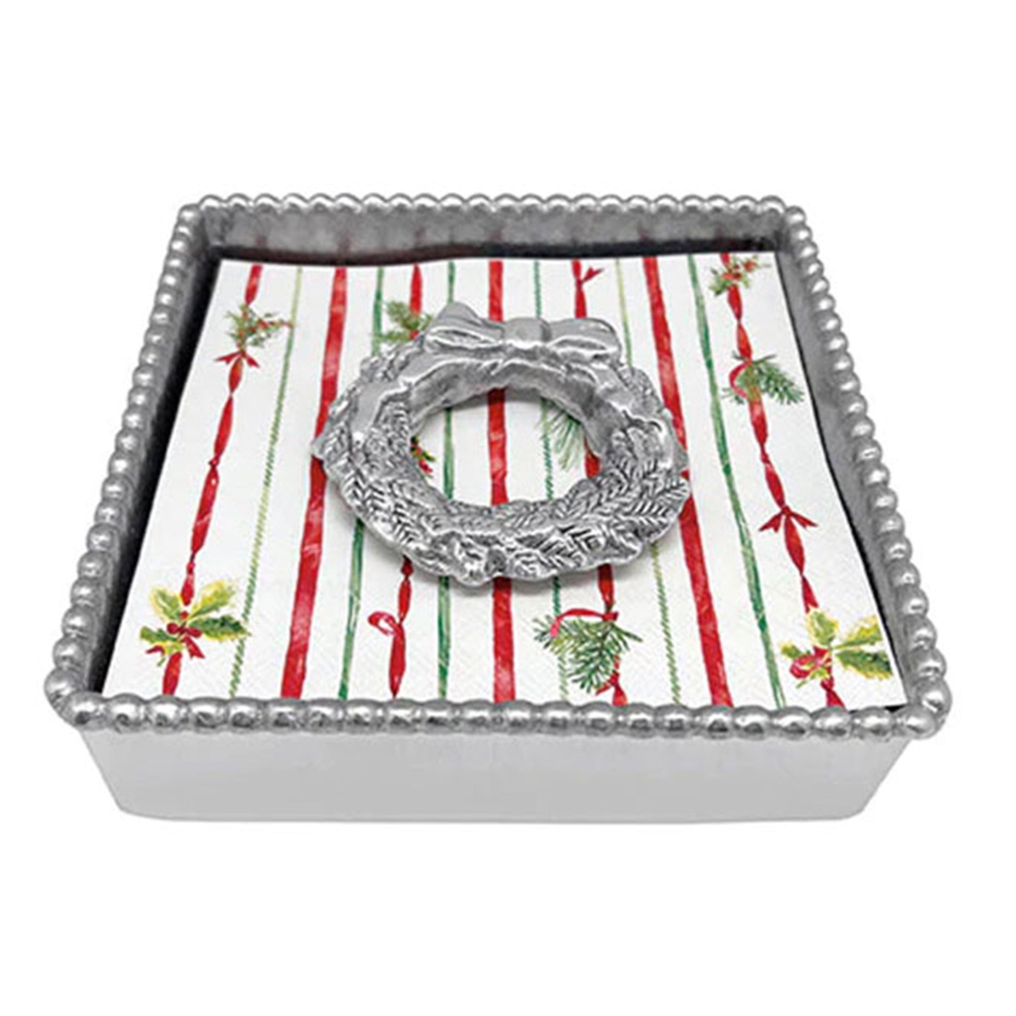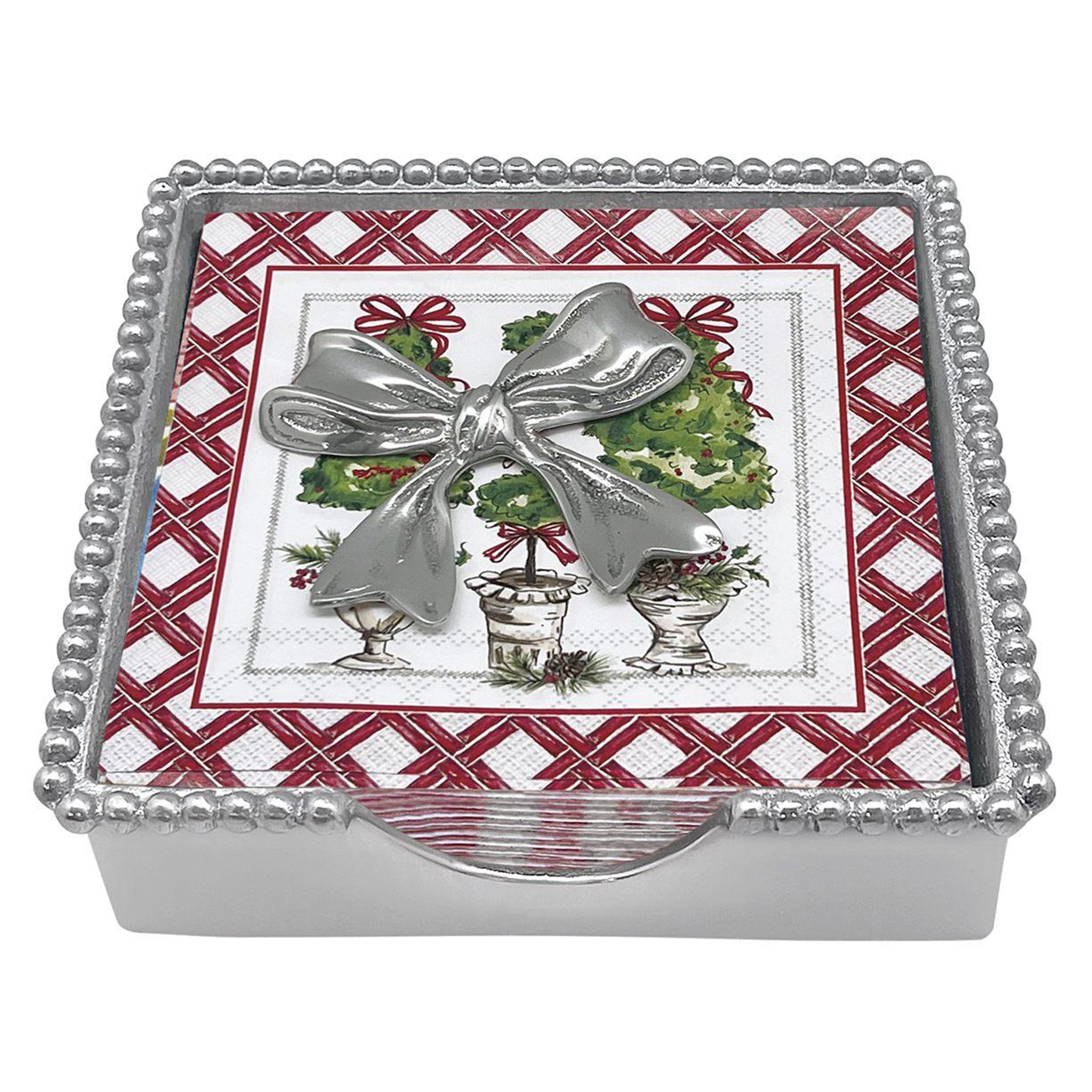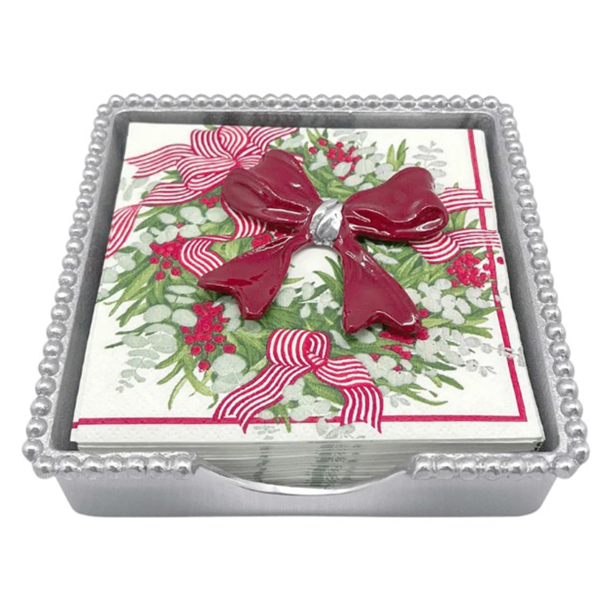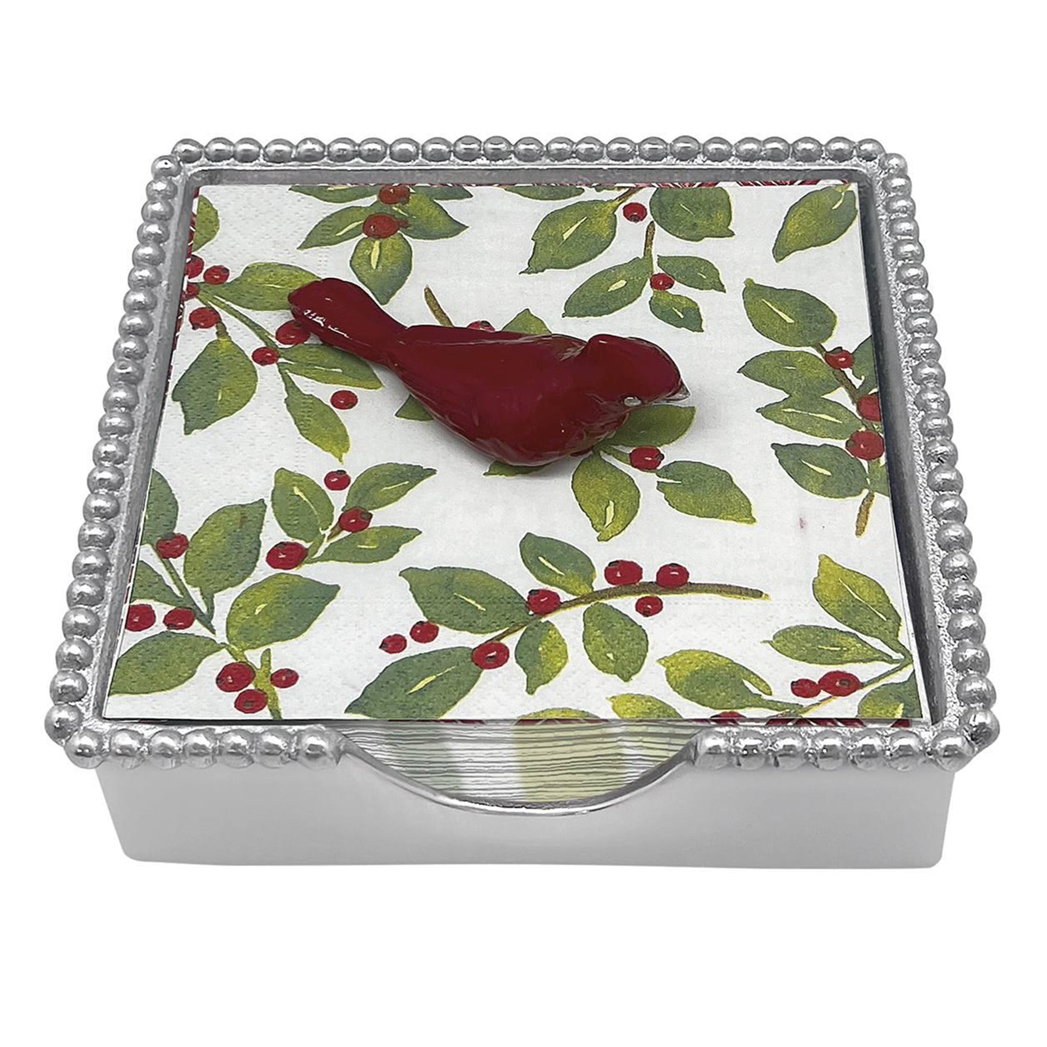 A stack of holiday patterned cocktail napkins by Caspari topped with a handcrafted Napkin Weight in a Beaded Napkin Box, sets the tone for your holiday festivities. Measures 5.75in L x 5.75in W x 1.5in H.