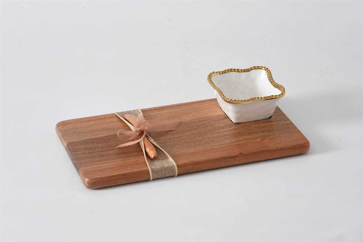 The Look of Metal with the Convenience of Porcelain. These gorgeous high-fired porcelain pieces convey traditional elegance edged with lustrous gold beads in titanium. Adds a touch of style to fancy dinners or everyday meals. They are food safe, dishwasher safe, stain resistant, and oven safe up to 500 degrees. The Entertaining Set Bowls are 2.75” Diam x 1.5” Deep. The wood board is NOT dishwasher safe.